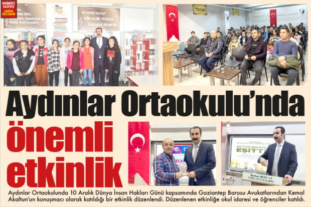Aydınlar Ortaokulunda 10 Aralık Dünya İnsan Hakları Günü kapsamında Gaziantep Barosu Avukatlarından Kemal Akaltun'un konuşmacı olarak katıldığı bir etkinlik düzenlendi. Düzenlenen etkinliğe okul idaresi ve öğrenciler katıldı.
