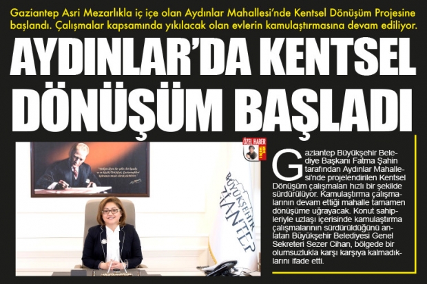 Gaziantep Büyükşehir Belediye Başkanı Fatma Şahin tarafından Aydınlar Mahallesi’nde projelendirilen Kentsel Dönüşüm çalışmaları hızlı bir şekilde sürdürülüyor. Kamulaştırma çalışmalarının devam ettiği mahalle tamamen dönüşüme uğrayacak. Konut sahipleriyle uzlaşı içerisinde kamulaştırma çalışmalarının sürdürüldüğünü anlatan Büyükşehir Belediyesi Genel Sekreteri Sezer Cihan, bölgede bir olumsuzlukla karşı karşıya kalmadıklarını ifade etti.