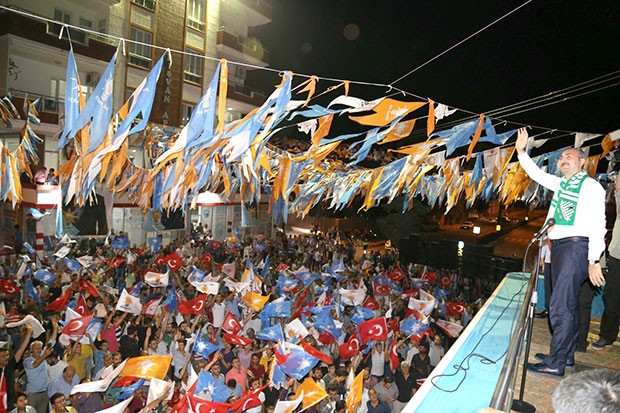 İftar'ın ardından ise partisinin lçe teşkilatına ziyaret planlayan Bakan Gül ve beraberindekiler, parti binası önünde binlerce kişi tarafından karşılandı. Parti önünde bekleyen seçim otobüslerinden brinin üzerine çıkan Gül ve beraberindekiler halka hitap etti.