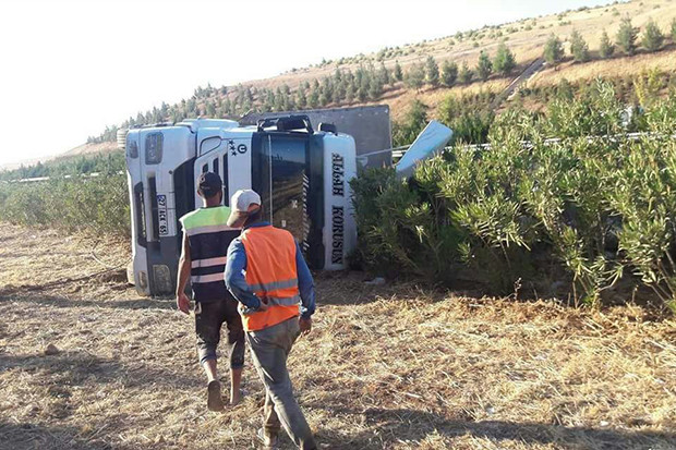 Şanlıurfa’da bariyerlere çarparak yoldan çıkıp devrilen kamyon sürücüsü yaralandı.
