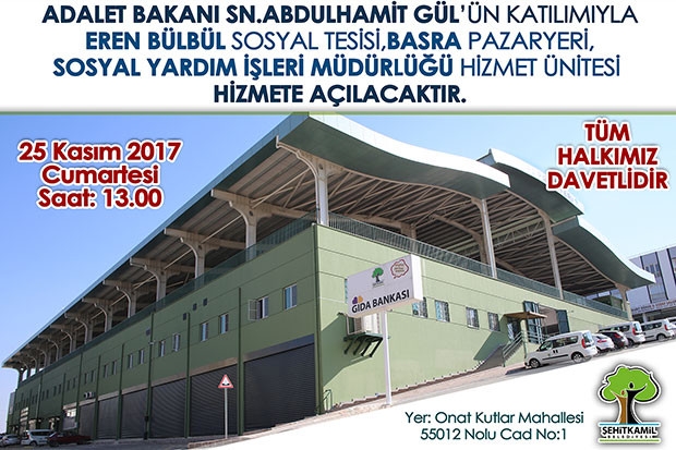 Şehitkamil Belediyesi tarafından inşası tamamlanan nitelikli hizmetlerin açılışı Adalet Bakanı Abdülhamit Gül’ün katılımıyla yapılacak. Onat Kutlar Mahallesi’nde 11 bin 650 metrekare alanda inşa edilen; Eren Bülbül Sosyal Tesisi, Basra Pazaryeri, Şehitkamil Belediyesi Sosyal İşler Müdürlüğü Hizmet Ünitesi’nin açılışı Cumartesi günü saat 13:00’da düzenlenen törenle gerçekleştirilecek.