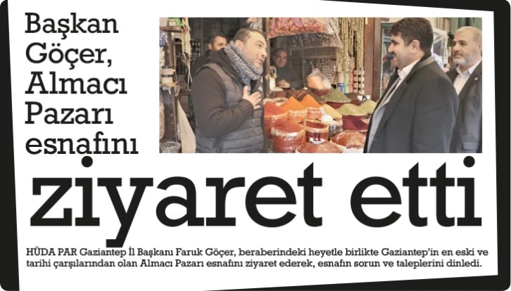 HÜDA PAR olarak esnafı hiçbir zaman bırakmayacaklarını ifade eden Göçer, “Her zaman esnafımızın yanında olacağız. Çünkü biz hep birlikte Gaziantep'iz ve hep birlikte güçlüyüz. Türkiye ve Gaziantep ekonomisinin bel kemiği olan esnafın sorunu en öncelikli meselimizdir. Şehrimizin her bölgesindeki esnafımızı ziyaret ediyor, sorun ve taleplerini dinliyoruz. Gaziantep'te asırlardır canlılığını koruyan çarşılar arasında yer alan tarihi Almacı Pazarı’ndaki esnafımızı ziyaret ettik. Tarihi ve kültürel yapısıyla dikkat çeken şehrimiz Gaziantep'in en eski çarşısı olan tarihi Almacı Pazarı, günümüzde de canlılığını korumaya devam ediyor olması bizi mutlu etti. Yöresel ve organik ürün denilince akla ilk gelen adres olan tarihi Almacı Pazarı'ndaki esnafımız, asırlardır ahilik anlayışı, kültürel tarihi ve kuşaktan kuşağa aktarılan iş yerleriyle çarşıyı ayakta tutmaya çalışıyor. Esnafımıza teşekkür ediyor, hayırlı, bereketli ve bol kazançlar diliyoruz.” ifadelerini kullandı.