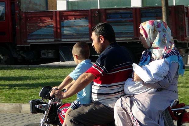 Trafiğin yoğun olduğu saatlerde Gaziantep İpek yolu üzerinden Sani Konukoğlu Bulvarı'na seyreden 2 çocuklu aileyi görenler korku dolu anlar yaşadı. Vatandaşların şaşkın bakışları arasında İpek yolu üzerinden hareket eden ailede motosikletin arka koltuğunda bir bebeğin ve sürücünün önünde bir çocuğun olması dikkatlerden kaçmadı.