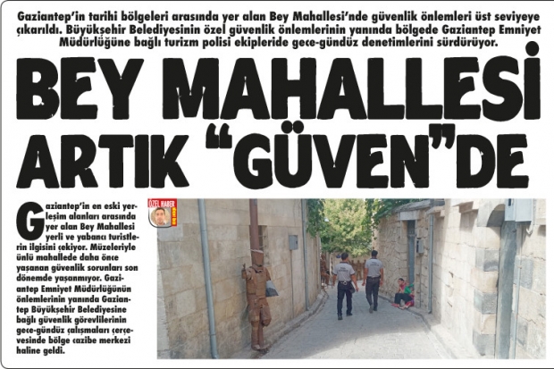 Gaziantep'in tarihi bölgeleri arasında yer alan Bey Mahallesi'nde güvenlik önlemleri üst seviyeye çıkarıldı. Büyükşehir Belediyesinin özel güvenlik önlemlerinin yanında bölgede Gaziantep Emniyet Müdürlüğüne bağlı turizm polisi ekipleride gece-gündüz denetimlerini sürdürüyor.