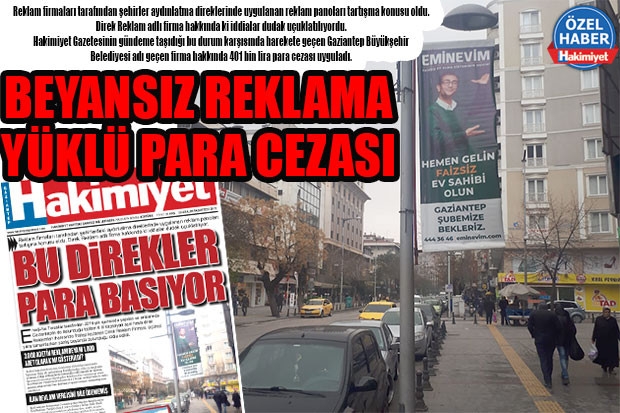 Reklam firmaları tarafından şehirler aydınlatma direklerinde uygulanan reklam panoları tartışma konusu oldu. Direk Reklam adlı firma hakkında ki iddialar dudak uçuklatılıyordu. Hakimiyet Gazetesinin gündeme taşıdığı bu durum karşısında harekete geçen Gaziantep Büyükşehir Belediyesi adı geçen firma hakkında 401 bin lira para cezası uyguladı.