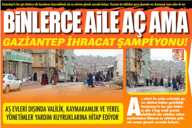 Gaziantep'te valilik, ilçe kaymakamlıkları ve yerel yönetimler olmak üzere on binlerce yoksul aileye yardım yapılıyor. Aş evleri ve çorba evleri başta olmak üzere çoğu yardım şova dönüşürken, yoksul ailelerin önemli b ölümü sabah saatlerinden itibaren aş evlerinde 2 kap sıcak yemek alabilmek için sıraya girmek zorunda kalıyor. 6-7 kilometre yol yürüyerek aş evlerinde sıraya giren yoksul vatandaşlar aldıkları yemeği evlerine götürüyorlar.
