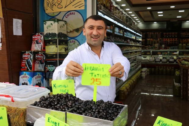 Gaziantep’te doğal ürünler satan bir kişi, tezgahında bulunan 28 çeşit zeytini ünlülerin isimleri ile satışa çıkardı. İbrahim Tatlıses, Emel Sayın, Müslüm Gürses ve Kibariye gibi isimlerin verildiği zeytinler 10 ile 30 TL arasında satılıyor.