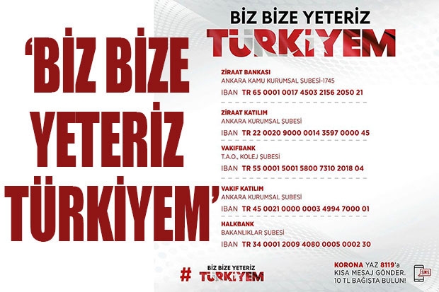 Corona virüsü tedbirleri kapsamında yeni kararlar alındığını vurgulayan Cumhurbaşkanı Recep tayyip Erdoğan, “Milli dayanışma kampanyası başlatıyoruz. ‘Biz Bize yeteriz Türkiyem’ diyerek başlattığımız bu kampanya için, Aile, Çalışma ve Sosyal Hizmetler Bakanlığımız tarafından, bir yardım hesabı açıldı. Ayrıca kısa mesaj numaraları üzerinden de bağış yapılabilecek. Kampanyayı, şahsım olarak, 7 aylık maaşımı bağışlayarak açıyorum” dedi.