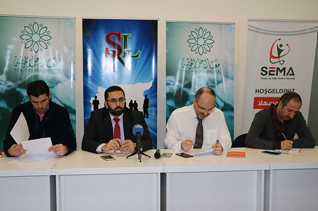 Suriye Sivil Topum Kuruluşları Birliği adına açıklamayı Sema Tıbbi ve İnsanı Yardım Derneği Başkanı Dr. Muhammed Hasan Mugrabiye yaptı. Dr. Mugrabiye, "Rejim ve destekçileri Doğu Guta’da katliam yapıyor. Her gün siviller çocuklar ve kadınlar hayatlarını kaybediyor. Oradaki insanlara yardım ulaştırılmasına izin verilmiyor. Birleşmiş Milletler'in bu saldırıları bir an önce durdurmasını istiyoruz. Orada yaşayan insanlar yıllardır savaşın gölgesinde hayatlarını devam ettirmeye çalışıyor. Rejim uluslararası yasaklı silahları kullanmaktan çekinmiyor. İnsanlar açlıkla mücadele ederken bütün bunlar dünyanın gözü önünde gerçekleşiyor. Bölgedeki sivil toplum kuruluşları olarak BM’den tarafsız olarak bu işi ele almasını ve bu saldırıları durdurmasını istiyoruz. Rejimle iletişime geçerek bu saldırıyı sona erdirmesini ve acil ihtiyaçların karşılanması talebinde bulunuyoruz” dedi.