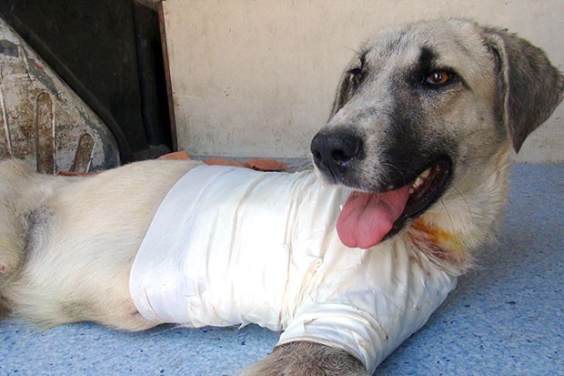 İslahiye’de kuyruğu ve ayağı bileğinden kesilmiş halde bulunan köpeğin sağ ön ayağı tamamen kesildi.