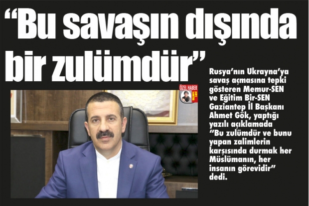 Rusya’nın Ukrayna’ya savaş açmasına tepki gösteren Memur-SEN ve Eğitim Bir-SEN Gaziantep İl Başkanı Ahmet Gök, yaptığı yazılı açıklamada “Bu zulümdür ve bunu yapan zalimlerin karşısında durmak her Müslümanın, her insanın görevidir” dedi.