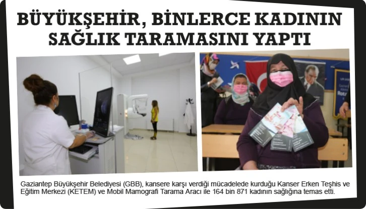 Kanserde erken teşhis için şehrin merkez, ilçe, kasaba ve köylerinde yaşayan her kadının hayatına dokunan GBB Sağlık Hizmetleri ve Engelliler Daire Başkanlığı ile Gaziantep İl Sağlık Müdürlüğü iş birliğinde kurulan KETEM ve Mobil Mamografi Tarama Aracı sayesinde 2015 yılından bu yana, mamografiden 53 bin 224, smear’den 34 bin 842, gaitada gizli kan taramasından (GGK) 8 bin 749 kadın faydalanırken, kadın sağlığı konusunda verilen eğitimlerden ise 48 bin 33 kadın faydalandı. Eğitim ve taramalar için 20 bin 23 kadının merkezlere ulaşımı GBB tarafından sağlanırken toplamda 164 bin 871 kadına hizmet verildi.