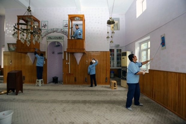 Özel araçları en son teknoloji ürünü elektrikli süpürgeleri ile cami ve mescit temizliğini yapan ekip, camilerin dış temizliğinin yanında halı, kapı, cam, ahşap, kitaplık ve fayansları da temizliyor.