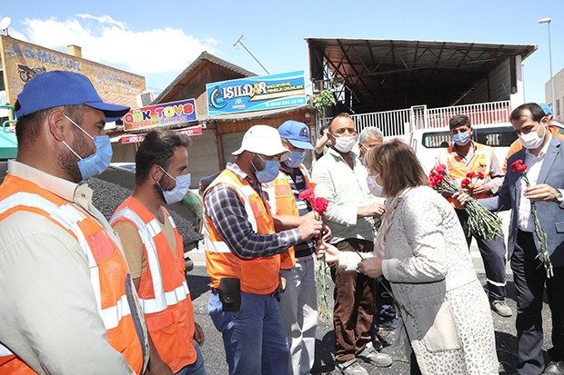 Büyükşehir Belediye Başkanı Fatma Şahin öte yandan 1 Mayıs Emek ve Dayanışma Günü nedeniyle sahada çalışma yürüten Büyükşehir Belediyesi işçilerini unutmayarak işçi bayramını kutladı, karanfil hediye etti, hatıra fotoğrafı çektirdi.