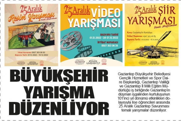 Gaziantep Büyükşehir Belediyesi Gençlik Hizmetleri ve Spor Daire Başkanlığı, Gaziantep Valiliği ve Gaziantep İl Milli Eğitim Müdürlüğü iş birliğinde Gaziantep’in düşman işgalinden kurtuluşunun 101’inci yıl dönümü etkinlikleri dolayısıyla lise öğrencileri arasında 25 Aralık Gaziantep Savunması temalı yarışmalar düzenliyor.