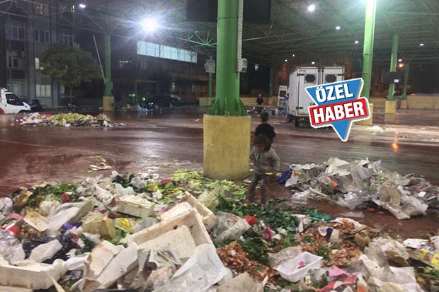 23 Nisan Mahallesi’nde kurulan Cumartesi Pazarının ardından geride kalan sebze ve meyveleri toplayan Suriyeli aileler topladıkları sebze ve meyveleri yaşadıkları baraka türü evlerine götürüyorlar. Pazarın sona ermesinin ardından uzay çatı pazarına doluşan Suriyeli aileler belediyelerin çöp arabalarından önce yere dökülen sebze ve meyveleri toplamaya çalışıyorlar.
