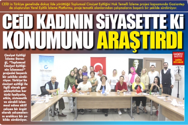 Cinsiyet Eşitliği İzleme Derneği, "Toplumsal Cinsiyet Eşitliğinin İzlenmesi" projesini başarılı bir şekilde sürdürüyor. Türkiye’de cinsiyet eşitliği ile ilgili olarak gerçekleştirilen her türlü faaliyetin, etkin, sistematik ve sürekli izlenmesi adına aktif çalışan bir örgüt olarak çalışmalarını aralıksız bir şekilde sürdürüyor. Gaziantep'te de etkin bir şekilde proje çalışmalarını sürdüren CEİD, Kent Konseyi Toplantı Salonu'nda atölye çalışmaların da izleme plânını oluşturmaya devam ediyor.