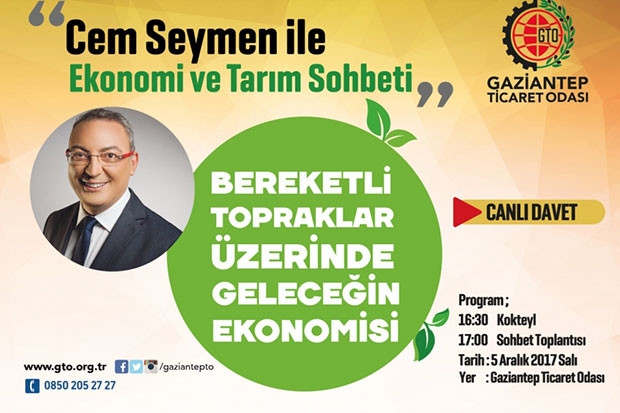 Gaziantep Ticaret Odası (GTO)nın üyelerinin gelişmeleri takip edebilmeleri için düzenlediği etkinlikler sürüyor. Bu çerçevede “CEM SEYMEN İLE EKONOMİ VE TARIM SÖYLEŞİSİ” etkinliği 5 Aralık 2017 Salı günü (Yarın) Saat 16.30’da Oda toplantı salonunda gerçekleştirilecek.