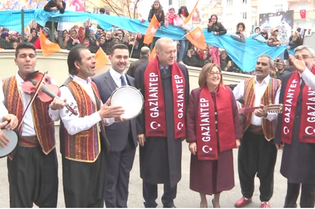 Cumhurbaşkanı ve AK Parti Genel Başkanı Recep Tayyip Erdoğan, partisinin ilçe belediye başkan adaylarını tanıtmak için geldiği Gaziantep’te çocuklara oyuncak dağıttı. Şahinbey Karataş Kapalı Spor Salonu'na gelirken coşkulu bir grup tarafından karşılanan Cumhurbaşkanı Erdoğan, çocuklara oyuncak dağıttı. Erdoğan’a üzerinde “Sayın Reisimiz R.T.E”, “Gaziantep’e hoş geldiniz”, ”Gastronominin Başkenti” yazılı Antep fıstıklı tatlı ikram edildi. Salon girişinde yerel müzisyenler tarafından karşılanan Erdoğan, onlarla hatıra fotoğrafı çektirdi. Antep’in yerel kıyafetlerini giyen çocuklar ise Cumhurbaşkanı Erdoğan’ın üzerine gül yaprakları serpti. Mehter takımının marşlarını da dinleyen Erdoğan, aralarında bölgeye ait mutfak eşyalarının da bulunduğu bir çok malzeme kullanılarak müzik yapan gençleri dinledi.