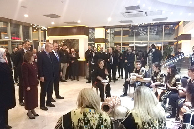AK Parti Gaziantep Adayları Tanıtım Toplantısı’na katılmak üzere Gaziantep’e gelen AK Parti Genel Başkanı ve Cumhurbaşkanı Recep Tayyip Erdoğan, büyük bir sürprizle karşılaştı. Bu yıl, Gaziantep Bakırcılar ve Sedefçiler Odası’nın yetiştirdiği kadın ustalarının da aralarında bulunduğu Büyükşehir Belediyesi Çocuk ve Gençlik Ritim Grubu, cumhurbaşkanına özel bir gösteri sundu. Gösteri karşısında etkilenen Cumhurbaşkanı Erdoğan, gösteriyi ilgiyle izledi. Cumhurbaşkanı, gösteri sonunda gençlerle ve eğitmenlerle sohbet etti, grubu Ankara’da performanslarını sergilemek üzere davet etti.