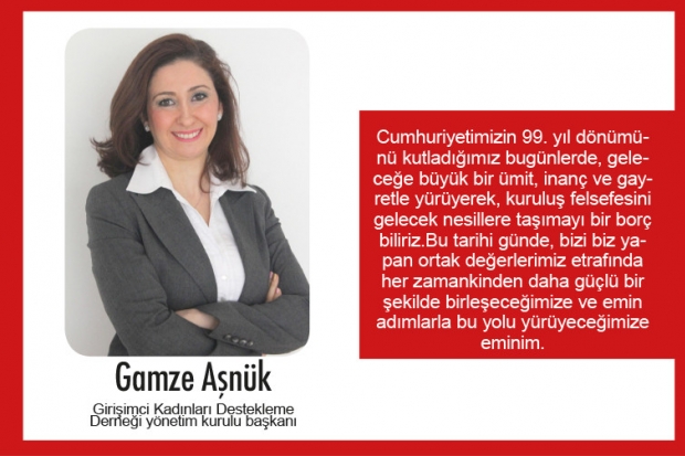 Cumhuriyetimizin 99. yıl dönümünü kutladığımız bugünlerde, geleceğe büyük bir ümit, inanç ve gayretle yürüyerek, kuruluş felsefesini gelecek nesillere taşımayı bir borç biliriz.Bu tarihi günde, bizi biz yapan ortak değerlerimiz etrafında her zamankinden daha güçlü bir şekilde birleşeceğimize ve emin adımlarla bu yolu yürüyeceğimize eminim. 99 yıldır ışıldayan, milletimizin geleceğini aydınlatan Cumhuriyetimizin kurulmasından kalkınmasına kadar Türk kadınının rolü şüphesiz ki çok büyüktür. Biz Türk kadınları olarak Cumhuriyetimizin ilelebet yaşamasını dilerken, Atamıza her zaman müteşekkiriz. 29 Ekim, bir doğuşun, bir devrimin, kısacası bir mucizenin yıl dönümüdür. Türk ulusunun 29 Ekim Cumhuriyet Bayramını yürekten kutluyorum.