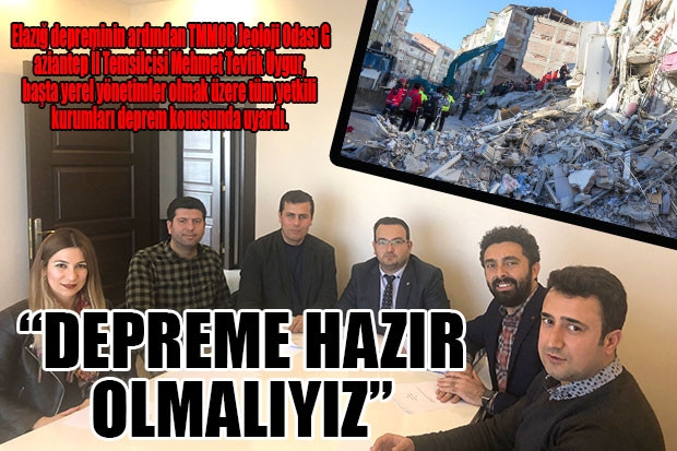 Elazığ depreminin ardından TMMOB Jeoloji Odası Gaziantep İl Temsilcisi Mehmet Tevfik Uygur, başta yerel yönetimler olmak üzere tüm yetkili kurumları deprem konusunda uyardı.