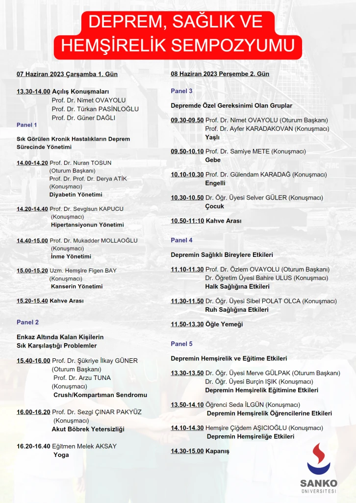 SANKO Üniversitesi Sağlık Bilimleri Fakültesi (SBF) Hemşirelik Bölümü tarafından “Deprem, Sağlık ve Hemşirelik” konulu sempozyum düzenlenecek.