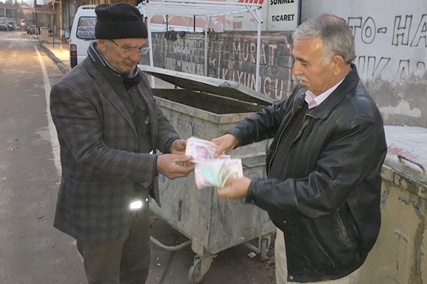 Nurdağı’nda emekli İlyas Candemir, içine 1000 euro, 500 dolar ve 800 lira para koyduğunu unuttuğu karton kutuyu çöp konteyneri yanına attı. Mahalle esnafı Abdurrahman Sönmez de yerde bulup sahte sandığı paraları toplayıp çöp konteynerine attı. Ardından Candemir'in anlatmasıyla gerçek olduğunu anladığı parayı çöpten alan Sönmez, sahibine teslim etti.