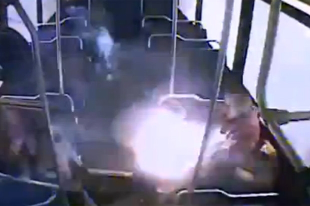 Bir otobüste yolculuk eden adamın cebinde bulunan elektronik sigara, bilinmeyen bir şekilde bir anda patladı. Olayda, pantolonu alev alan adam yaralandı. O anlarsa anbean otobüsün güvenlik kamerasına yansıdı.