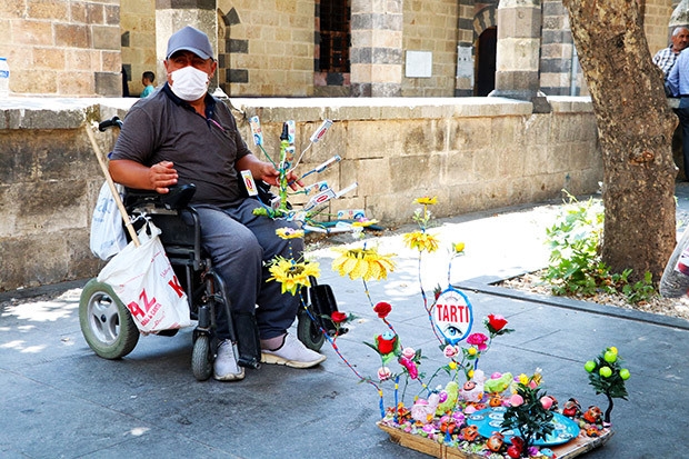 Gaziantep’te çocukken geçirdiği yüksek ateşli hastalık nedeniyle belden aşağısı felç olan 47 yaşındaki Yücel Ak, yaklaşık yarım asırdır tekerlekli sandalyeye bağlı halde yaşıyor. 18 yıl çalıştığı fabrikadan emekli olduktan sonra tekerlekli sandalyesiyle çalışmaya sokaklarda devam eden Ak, elleriyle süslediği tartısının başında her gün aynı yerde müşterilerini bekliyor.