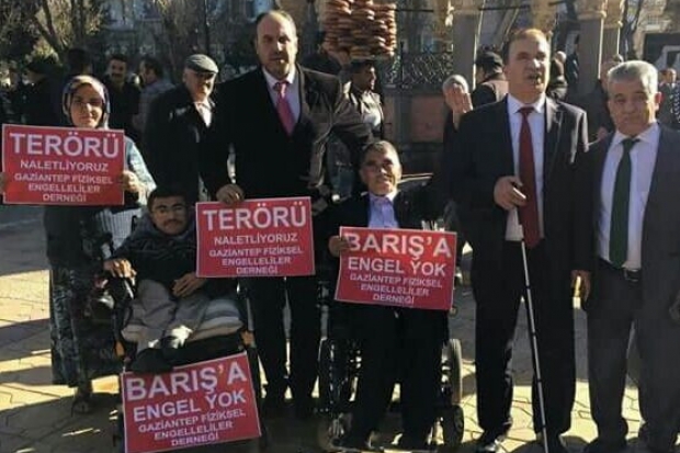 Gaziantep Fiziksel Engelliler Derneğinin binası önünde bir araya gelen, engelliler, ‘Barışa engel yok’, ‘Terörü lanetliyoruz’ yazılı pankartlar açıp sloganlar attı.