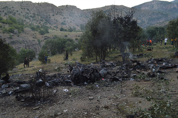 Şırnak’ın Uludere ilçesine bağlı Şenoba Beldesinde yüksek gerilim hattına takılarak düşen Cougar tipi helikopterin enkazında inceleme çalışmaları devam ediyor.