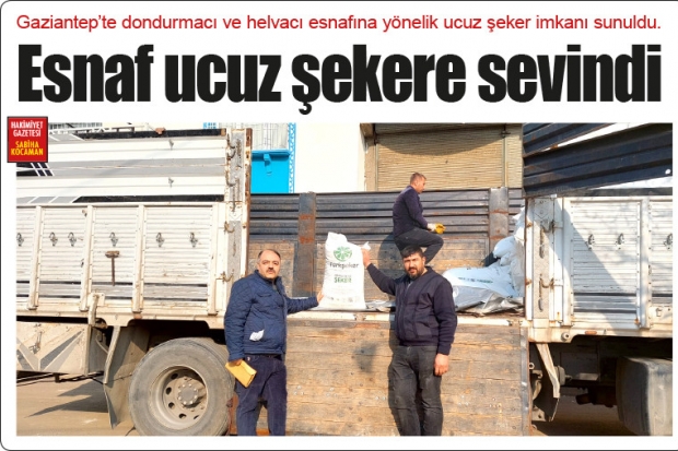 Gaziantep Helvacılar ve Dondurmacılar Esnaf ve Sanatkarlar Odası Başkanı Emin Özlü, esnafın faydalanması için Malatya Şeker Farikasıyla yaptıkları anlaşma neicesinde ilk parti iki tır şekerin kentte geldiğini ve esnafa dağıtıldığını dile getirdi.
