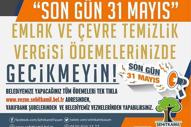Şehitkamil Belediyesi; emlak, çevre temizlik, ilan ve reklam vergilerinin birinci taksit ödemeleri konusunda vatandaşları uyardı. Ödemeler 31 Mayıs Perşembe 2018 günü mesai bitimine kadar nakit, kredi kartı, posta, banka ve online olarak yapılabilecek.