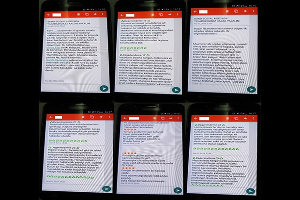 Bu yazışmaların birisinde şu ifadeler yer alıyor: “Bunu sosyal medyada yayabildiğimiz kadar yayalım.. Bu gün İskenderun’da talebeci bölgeci iki arkadaş tahliye oldu. İlk değerlendirmeleri Muammer Abi sohbet ediyormuş, emekli olmuş tatlı ısmarlamış koğuşa, günlük 100 rekat namaz kılıyorduk, oruç tutuyorduk, dedi. Cezaevi haftalık 700 kitabı kontrol ediyormuş sizin için. Bırakın ben kalayım dedim diyor, izin vermemişler. Bir uzman çavuş varmış sabahları spor yaptırıyormuş, esnaf ağabeyler orada da kimseye kahramanlığı kaptırmamışlar bir arkadaş cebindeki paranın aynısıyla çıkmış dışarı, Salı günleri kötü oluyor aileler gelince perişan oluyor insanlar, dedi. Onun dışında bizimkiler aynı sohbet, muhabbet, dua, namaz, tesbihat, yeme, içme, voleybol maçı.”