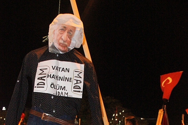 Gaziantep demokrasi nöbetine katılan bir vatandaş, Fethullah Gülen’in kuklasını asarak, meydanda gezdirdi.