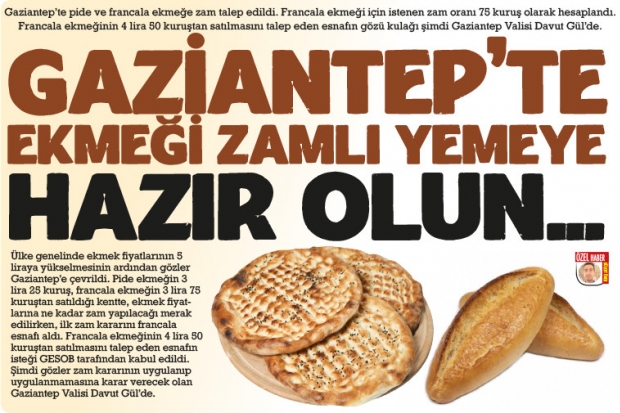 Ülke genelinde ekmek fiyatlarının 5 liraya yükselmesinin ardından gözler Gaziantep’e çevrildi. Pide ekmeğin 3 lira 25 kuruş, francala ekmeğin 3 lira 75 kuruştan satıldığı kentte, ekmek fiyatlarına ne kadar zam yapılacağı merak edilirken, ilk zam kararını francala esnafı aldı. Francala ekmeğinin 4 lira 50 kuruştan satılmasını talep eden esnafın isteği GESOB tarafından kabul edildi. Şimdi gözler zam kararının uygulanıp uygulanmamasına karar verecek olan Gaziantep Valisi Davut Gül’de.