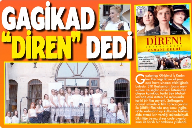 Gaziantep Girişimci İş Kadınları Derneği Pazar akşamı açık hava sinema etkinliğinde buluştu. STK Başkanları ,basın mensupları ve seçkin davetli listesinden oluşan konuklar, tarihi Bey Mahallesi’nde eski Antep Evi avlusunda tarihi bir film seyretti. Suffragette orjinal isminde ki film Türkçe çevirisi ile DİREN filminde ana konu İngiltere’de kadınların oy kullanma hakkını elde etmek için verdiği mücadeleydi. Etkinliğe beyaz dress code uygulaması ile farklı bir ambians yüklendi.