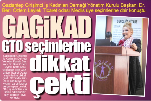Gaziantep Girişimci İş Kadınları Derneği Yönetim Kurulu Başkanı Dr. Beril Özlem Leylek, hafta sonu yapılacak olan Gaziantep Ticaret Odası seçimlerine dikkat çekti. GTO Meclisinde ki kadın üye sayısının az olmasına vurgu yapan Leylek, "Bu; iş kadınları için kabul edilebilir bir sayı değildir" diye konuştu.