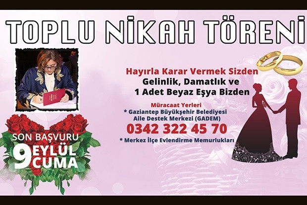 Ayrıca toplu nikah töreniyle alakalı kayıt ve daha fazla bilgi için Büyükşehir Belediyesi Sağlık ve Sosyal Hizmetler Daire Başkanlığı Aile Destek Merkezi’nin (342) 322 45 70 nolu telefonundan ulaşılabilir.