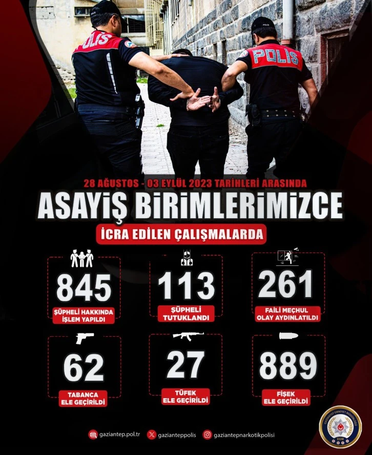 Belirtilen olaylara karıştıkları tespit edilerek yakalanan 845 şüpheliden, 113’ü sevk edildikleri Adli Mercilerce tutuklanmış, 732 şüpheli ise serbest bırakılmıştır.