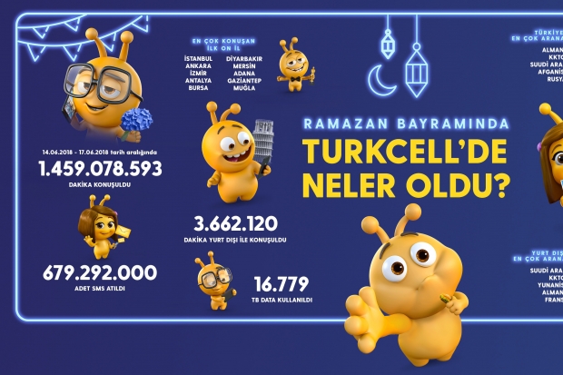 Turkcell, arife ve Ramazan Bayramı’nı kapsayan 14-17 Haziran tarihleri arasında en yoğun dönemlerinden birini yaşadı. Bu süreçte kullanıcılar Turkcell’de şimdiye kadarki en fazla data tüketimine imza attı. Bayram tatilinde mobil internetten yoğun olarak faydalanan Turkcell’lilerin bu yılki data kullanımı yaklaşık 17 bin terabayt ile rekor seviyeye ulaştı. En fazla data kullanımının yapıldığı ilk 10 il ise sırasıyla İstanbul, Ankara, İzmir, Antalya, Bursa, Diyarbakır, Mersin, Adana, Gaziantep, Muğla oldu. Bayram tatili boyunca sevdikleriyle yaklaşık 1,5 milyar dakika konuşan Turkcell müşterileri, 680 milyon adet SMS gönderdi. Ses, SMS, data kullanımının en fazla olduğu ve iletişimin en fazla yaşandığı il yine İstanbul oldu. Bayramda en çok konuşan 10 il sıralamasında İstanbul’u, İzmir, Ankara, Antalya, Bursa, Mersin, Muğla, Kocaeli, Hatay, Diyarbakır takip etti.