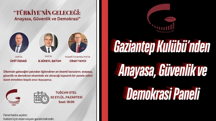Gaziantep Kulübü, ülkemizin geleceğini yakından ilgilendiren konuların tartışılacağı önemli bir panele ev sahipliği yapıyor. “Türkiye’nin Geleceği: Anayasa, Güvenlik ve Demokrasi” başlıklı panel, 22 Eylül 2025 Pazartesi günü saat 18.00’de Tuğcan Otel’de düzenlenecek.