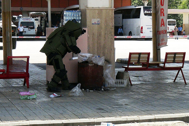Gaziantep otogarında çöp kovasına bırakılmış ve arasında roket motoru ve uçaksavar mermilerinin de bulunduğu mühimmat bulundu.