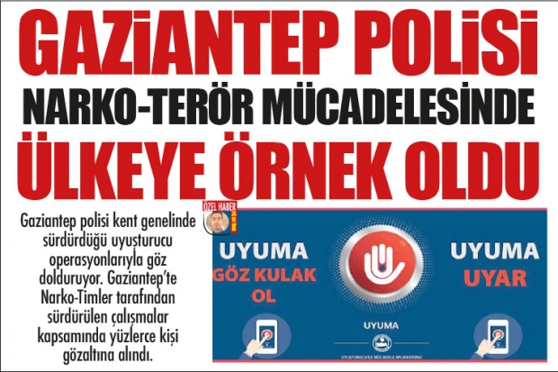 Gaziantep polisi son yıllarda uyuşturucu ve satıcılarına yönelik olarak önemli çalışmalara imza attı. Gaziantep İl Emniyet Müdürlüğü'nün bu çalışmaları İçişleri Bakanlığında göz doldururken, diğer illerde yapılan çalışmalara da örnek teşkil etti. Gaziantep'te uyuşturucu ve satışına yönelik mücadelede önemli bir noktaya gelindi.