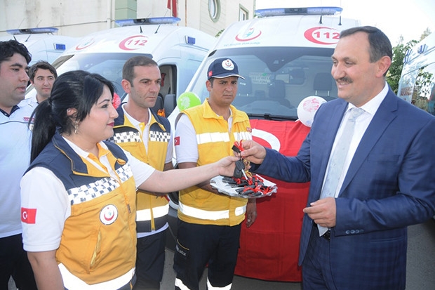 Yapılan konuşmaların ardından 10 yeni ambulans anahtarları şoförlere teslim edildi.