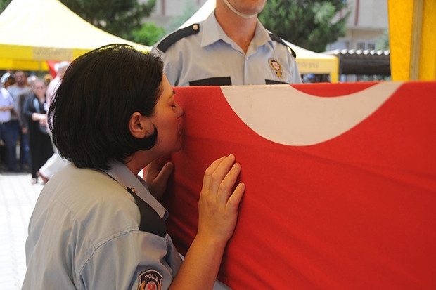 İZMİR’in Konak İlçesi’nde trafik akışını düzenlediği sırada motosikletin çarpmasıyla şehit düşen 33 yaşındaki polis memuru Sabri Emir, memleketi Gaziantep’in Araban İlçesi’nde son yolculuğuna 3 bin kişi tarafından uğurlandı. Törene polis üniformasıyla katılan Özlem Emir, şehit eşinin tabutunu öperek gözyaşı döktü.