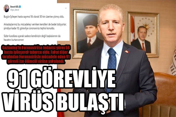 Gaziantep Valisi Davut Gül sosyal medyadan yaptığı açıklamada, 91 görevliye korona virüs teşhisi konulduğunu belirtti. Kentte 1 günde iyileşen hasta sayısının ise 56 olduğunu belirten Gül paylaşımında, "Bugün İyileşen hasta sayımız 56 olarak 50’nin üzerine çıkmış oldu. Arkadaşlarımız bu mücadeleyi verirken kendileri de bedel ödüyorlar; şimdiye kadar 91 görevliye coronavirüs teşhisi konuldu. Sizler kurallara uyarak sadece kendinizin değil başkalarının da hayatını kurtarıyorsunuz" ifadelerini kullandı.