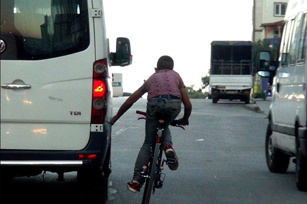 Gaziantep'te trafikte seyir halinde olan bir otobüse tutunarak giden bisikletli genç, kazaya davetiye çıkardı.