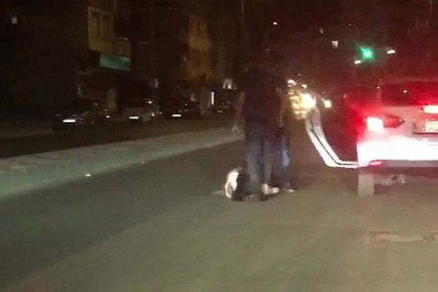 Otomobilin kapısını bırakmayan kadın daha sonra araçtan inen bir erkek şahıs tarafından kolundan tutularak yola savurdu. Yere düşen genç kadın ağlarken, araç ve şahıslar ise hızla uzaklaşarak gözden kayboldu.